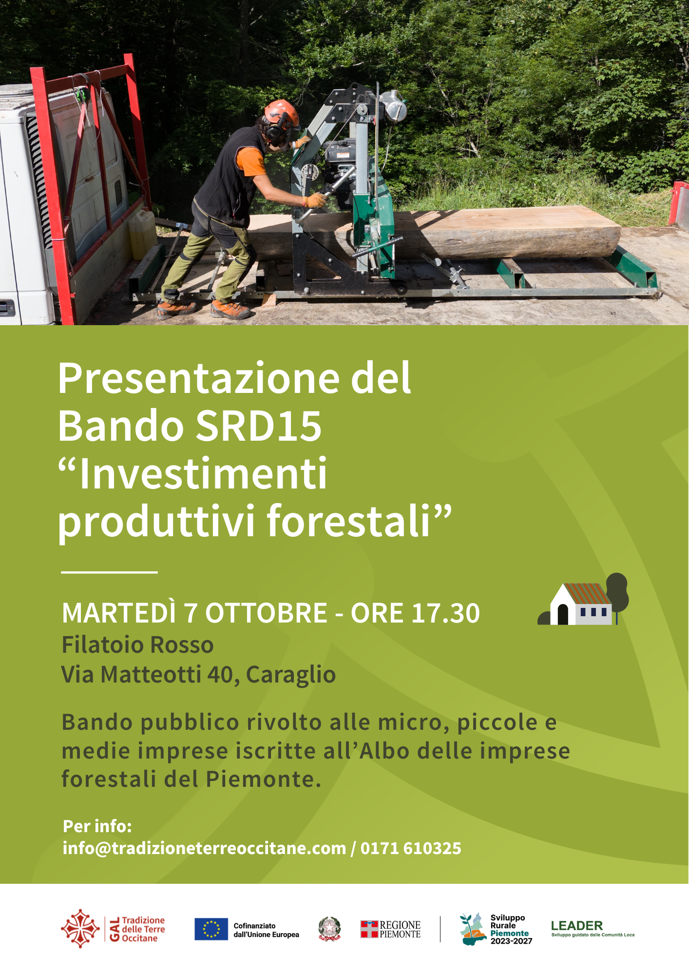Descrizione Presentazione del bando SRD15 "Investimenti produttivi forestali" GAL Tradizione delle Terre Occitane Martedì 07 ottobre 2025 ore 17,30 a Caraglio