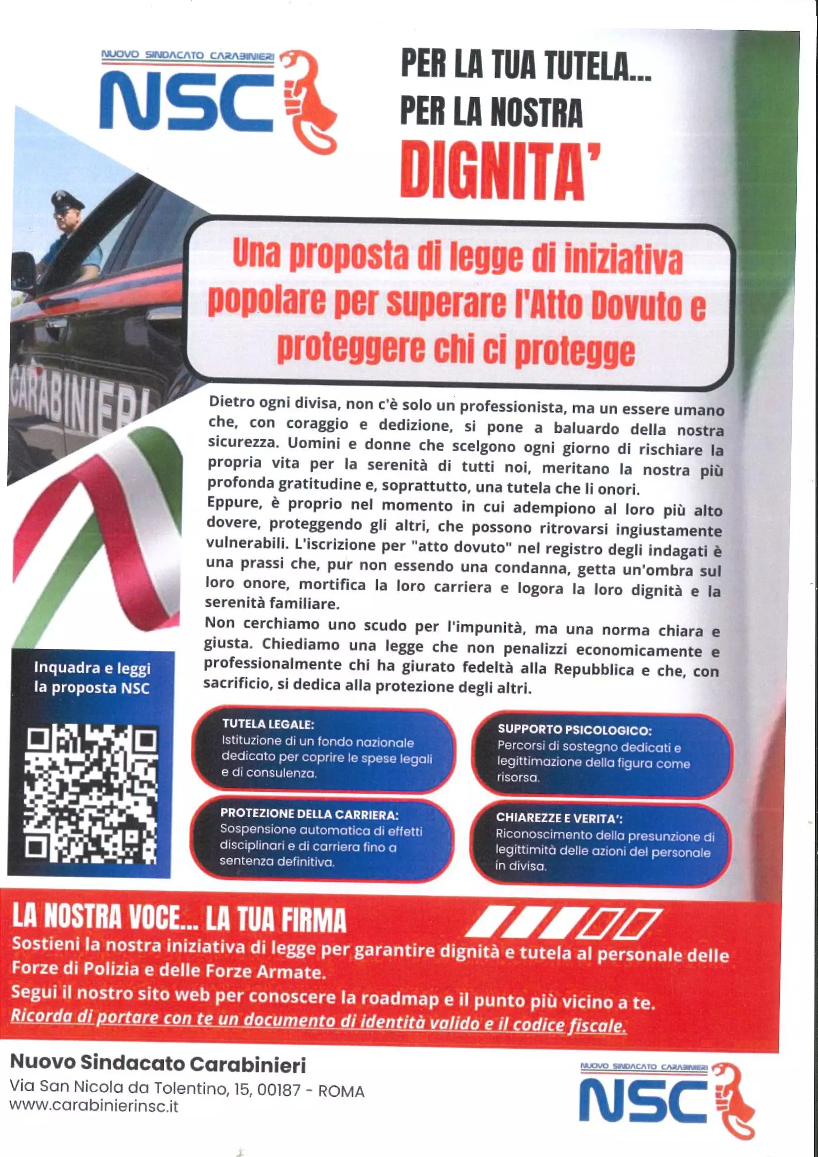 Negli uffici comunali sono disponibili i moduli per sottoscrivere il progetto di legge di iniziativa popolare promosso dal "Nuovo Sindacato Carabinieri"